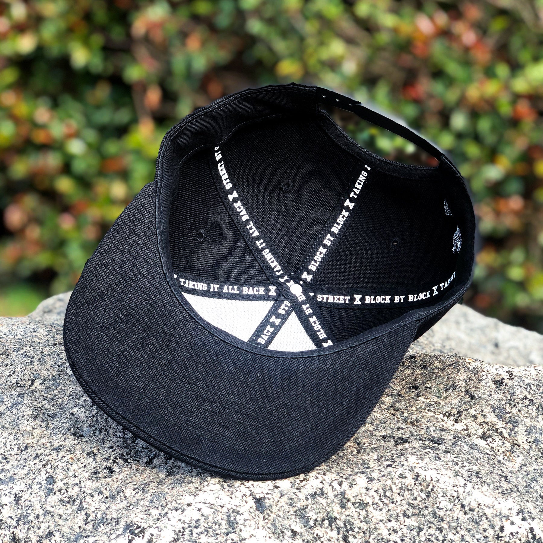 Custom-made Earth Crisis black snapback. The front logo is 3D puff embroidery with green outline and the back has the wrenches embroidered beside the snap. The piping on the inside of the hat features Firestorm lyrics.